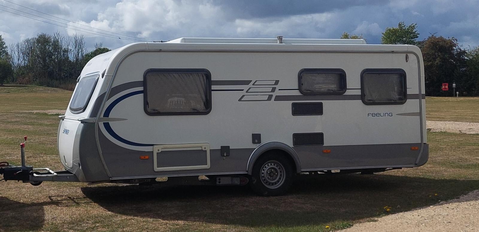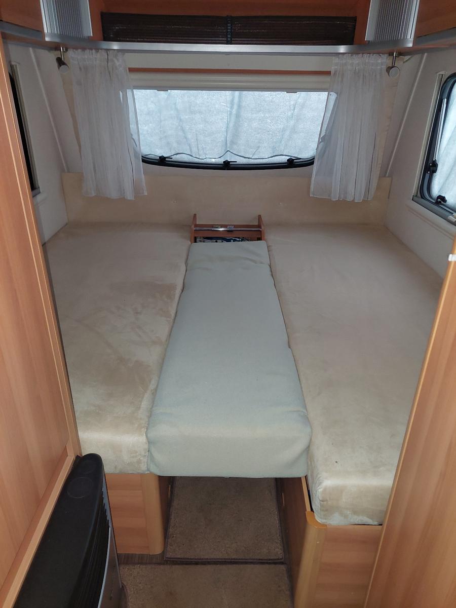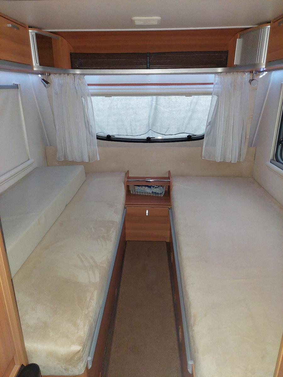 Hymer Eriba Feeling 470 - Guter Zustand. Der Wowa hat keinen Hagelschaden.zulässiges Gesamtgewicht 1500 kg100 km/h ZulassungNichtraucherwohnwagenDer Wohnwagen ist durch seine Batterie Autark.Wir sind die 3. Besitzer und haben einmal im Jahr eine 2-3 Wochen Urlaubstour damit gemacht.Ausstattung:AntischlingerkupplungAlKo Mammut MoverStaukasten Klimaanlage Truma Saphir 230 Volt mit FernbedienungMarkise von OmnistoreKlappbarer Fahrradträger auf der DeichselDie Bremsen vom Wohnwagen und die Gasdruckfedern vom Aufstelldach sind 2025 erneuert worden.2024 ist ein neuer Mover montiert worden.Innenausstattung:Einzelbetten mit den Maßen:Das rechte Bett 2,00 m x 0,80 m und das linke 1,90 m x 0,80 m.Durch ein zusätzliches Matratzenteil können die Einzelbetten zu einem großen Doppelbett, mit den ca. Maßen 2,00 m x 2,00 m, gemacht werden.Die Dinette im Heck kann zu einem Bett mit den ca. Maßen 2,00 m x 1,00 m umgebaut werden.Truma Gas HeizungDometic Kühlschrank 12/ 230 Volt und Gas3 Flammen Gaskocher - die Gasgeräte funktionieren perfekt.Zum Abspülen ist eine Rundspüle vorhanden.Toilettenraum mit Kassetten Toilette und Waschbecken.Warmwasserboiler elektrisch 230 Volt.Alle Leuchten im Wohnwagen sind LED Lampen.Im Bugkasten ist Platz für 2 x 11 kg Gasflaschen.Das Reserverad befindet sich auch dort.Der Wohnwagen ist dicht und hat keine Wasserschäden.Angemeldet ist der Wagen von 04/10.HU und Gasprüfung gültig bis Juli 2027.Im Winter steht der Wohnwagen im Carport und mit einer Abdeckhaube. Die Abdeckhaube wird mit verkauft.
