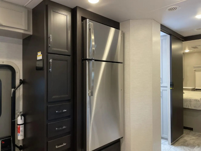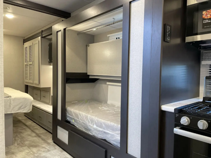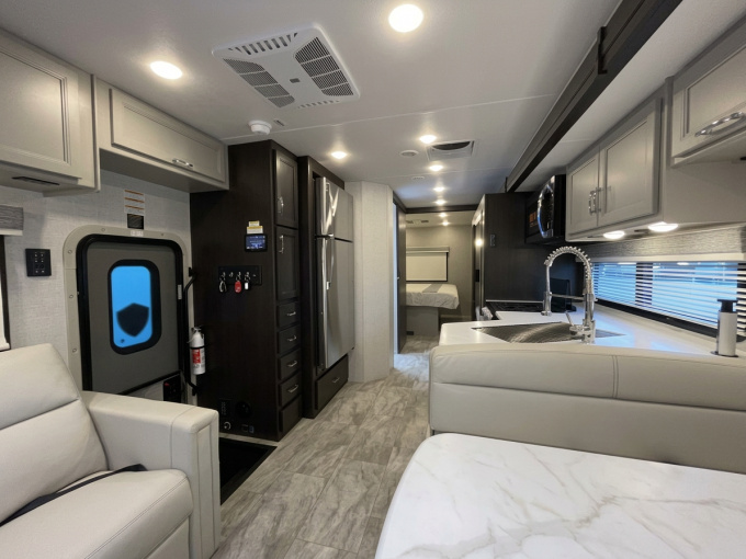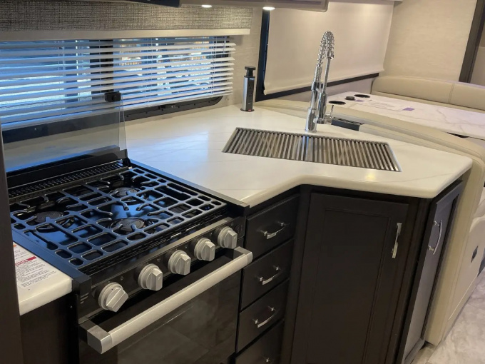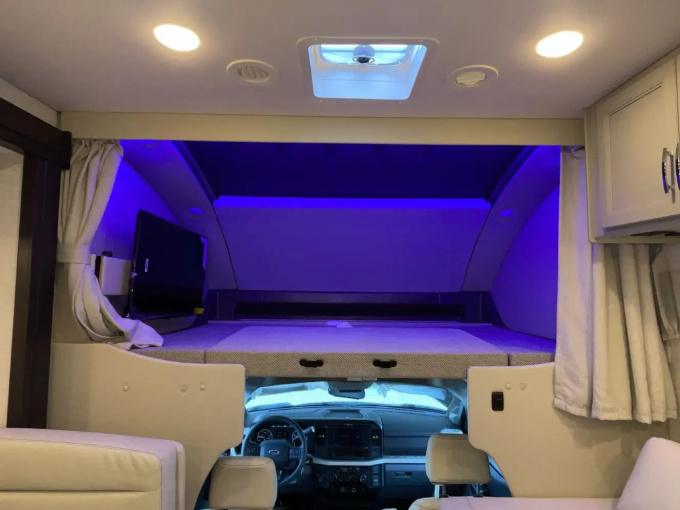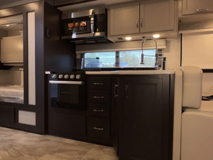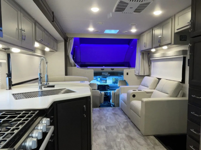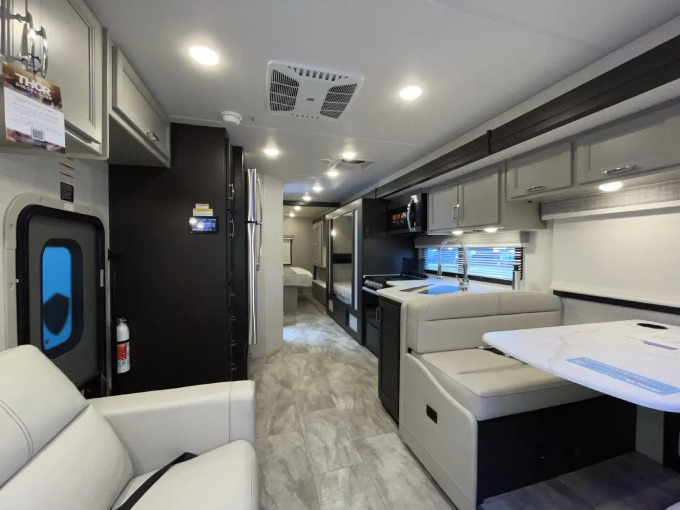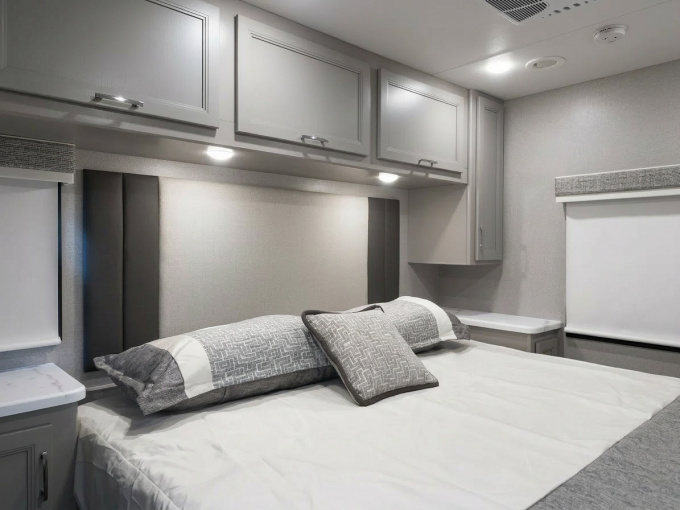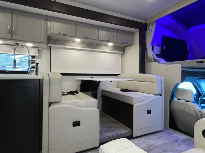 Планировка R36 ориентирована в первую очередь на семью: здесь есть просторная задняя спальня с king-size кроватью, двухъярусные кровати, удобная жилая зона и хорошо организованная кухня. Дополняет компоновку большой слайдер, за счёт которого салон становится заметно просторнее и удобнее для длительного проживания. Размеры автодома составляют примерно 11,33 м в длину, 2,52 м в ширину и 3,84 м в высоту, что делает его полноценным домом на колёсах, а не просто кемпером для коротких выездов.
