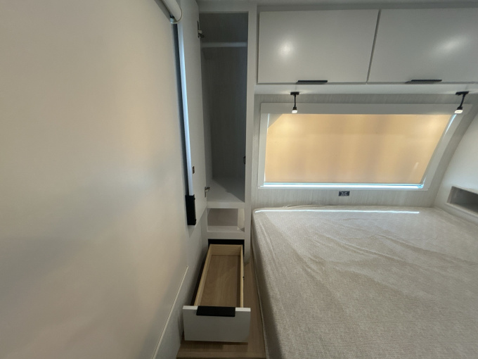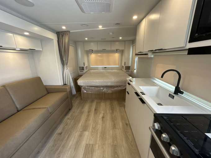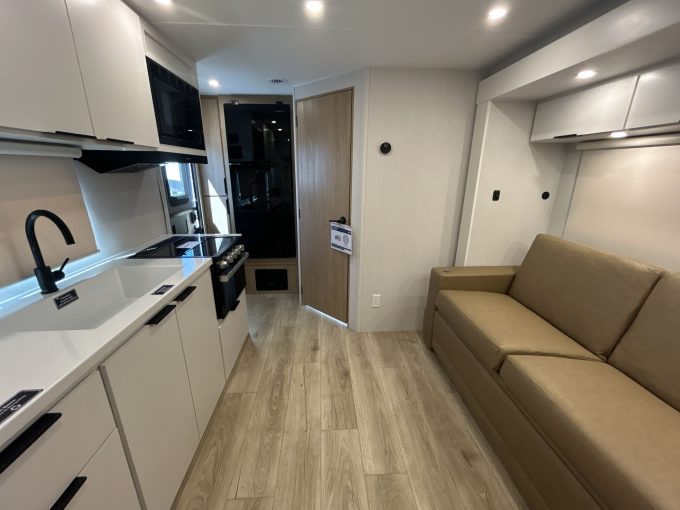 Современный американский прицеп-дача для комфортных путешествий вдвоём или небольшой семьёй. Это компактная, но очень продуманная модель с акцентом на комфорт, качественную отделку и удобство в поездках. По официальной спецификации длина прицепа составляет 6,99 м, высота 3,20 м, масса 2150 кг, а GVWR — 2722 кг. Модель рассчитана на 3 спальных места и отлично подходит тем, кто хочет получить полноценный жилой прицеп в удобном компактном формате.